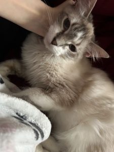 My cat is very skiddish around new people usually she has never been outside and is most likely terrified she has blue eyes she is fluffy a have grey and white fur