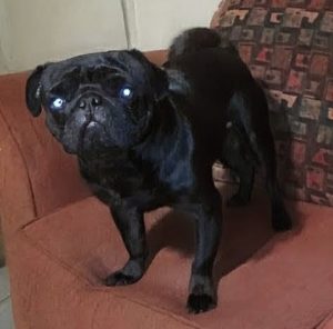 Skippy is an all black 2 year old unfixed male pug. He is super friendly and hyper. His coat is very short and shiny.