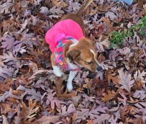 Brown and white 8 lb dog harshly missing her right ear. Wearing a pink flowered dress and pink collar with a QR code