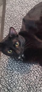 Domestic shorthair black cat with a little white patch of the front of neck, little head., yellow eyes, pointy ears