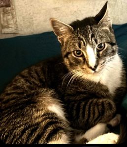 Tabby Cat. Grey with black stripes, white chest/paws, white stripe on his nose.