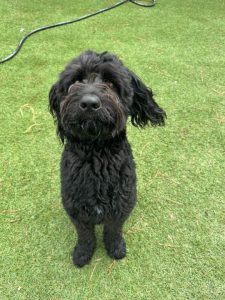 Solid Black Neutered and Microchipped, 61 LBS, small white patch on chest.