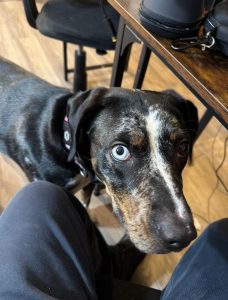 Black dog with White patches. She has a pink color and both her eyes are different colors