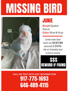 Blue monk parakeet by the name of Junie. He is a bit skittish but is friendly to humans. responds to his name, saying peekabo, and asking "what you're doing"