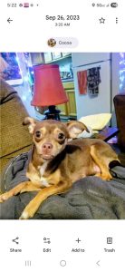 Cocoa is under 4lbs, she is very friendly but does not like hats or face masks she looks like a mini-pin but is full blooded chihuahua. She's our light and we need her home