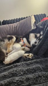 Black and white husky, bonded with a tan beagle hound named Frappe that has a leg injury, and might be together
