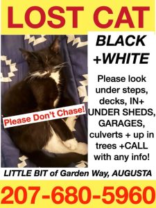 Little bit is a four month old, short haired black cat with patches of white on his chest, white socks and a half white mustache. He has a male and unfixed.. He was last seen on Garden Way in the Riverside Drive mobile home park. Please help us bring our baby boy home. Mama kitty and his family are desperately looking for him.
