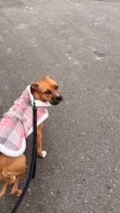 She is a sweet girl but timid around people. She loves to play with other dogs and is food motivated.