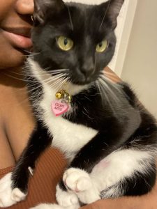 3 year old spayed female, black and white. white chest, paws and whiskers. yellow eyes. pink and blue collar and pink tag with name and number to call. blue moon charm and bell attached.