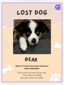 Bear is a tricolor Mini Aussie, mostly black with white on his head and chest, with spots of brown. He's sweet but skittish around people.