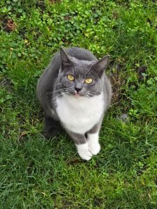 Very friendly, not chipped, not spayed dark Grey and white female. We believe she is a Russian Blue. She does come to her name.