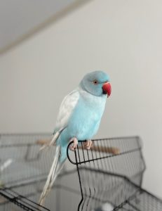 Light blue feathers, bright red beak, and pale eyes with an orange ring. Very tame and friendly, used to people, may respond to their name- Shona