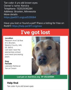 *Someone else saw her by the BBE Elementary school heading towards Jenniges Meats @ 10am.