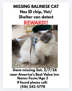 White / grey pointed Balinese car with blue eyes. Foxie is a very friendly, sweet girl who got out of her carrier while traveling from NY to FL at Americas Best Value Inn in Darien, GA