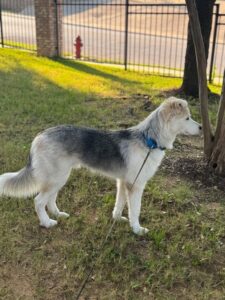 Keanu is a husky/australian Shepard mix, he has a lot of white fur but he has a large black spot on his back with gray and tan near ears. He has a tan spot on the back of his right arm and a fluffy tail that curls like a husky’s