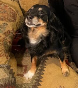 Breed: Dachshund, long haired, mix Color: Black, tan in legs, grey in snout, a little white in chest and white front right paw