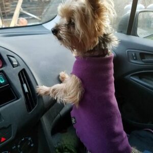 Older yorkie, 6.5 lbs., very few teeth, tongue hangs out, pink collar and purple sweater when she went missing