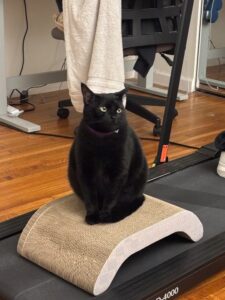 Luna is a 2 year old black cat with a purple collar. She is very shy and scared, as she’s newly adopted. She has some silver hairs, but otherwise is fully black
