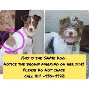 Skittish, flight risk. May have a limp due to her dew claw. may look shaggier and dirty!