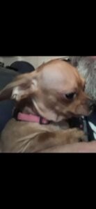 She is a brown-tan and white-grey Teacup Chihuahua. Small and 10 years old. When she gets out, she roams.