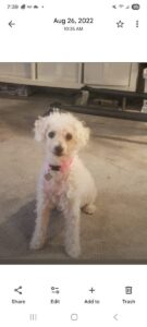 Toy poodle mix last seen with a blue plaid Christmas sweater on. Very old , blind in both eyes . Will answer to razz or raspberry.