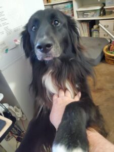 Black with white chest and feet. Tip of tail is missing. He is mentally challenged from prior abuse and has the mental age of a 4-month puppy. 225-636-0037 if found thanks