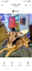 Cocoa is under 4lbs, she is very friendly but does not like hats or face masks she looks like a mini-pin but is full blooded chihuahua. She’s our light and we need her home