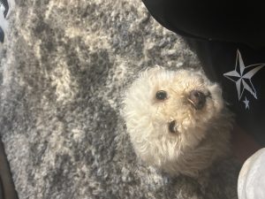 Small white dog with curly hair. Has a collar on with a blue name tag