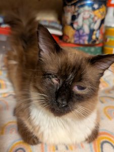 Cream color with siamese markings. He is a special needs cat as he is deaf and has sight in only one eye.