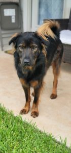 Black coat with a orange puffy tail and brown feet, also has brown circles on the outside of her eyes